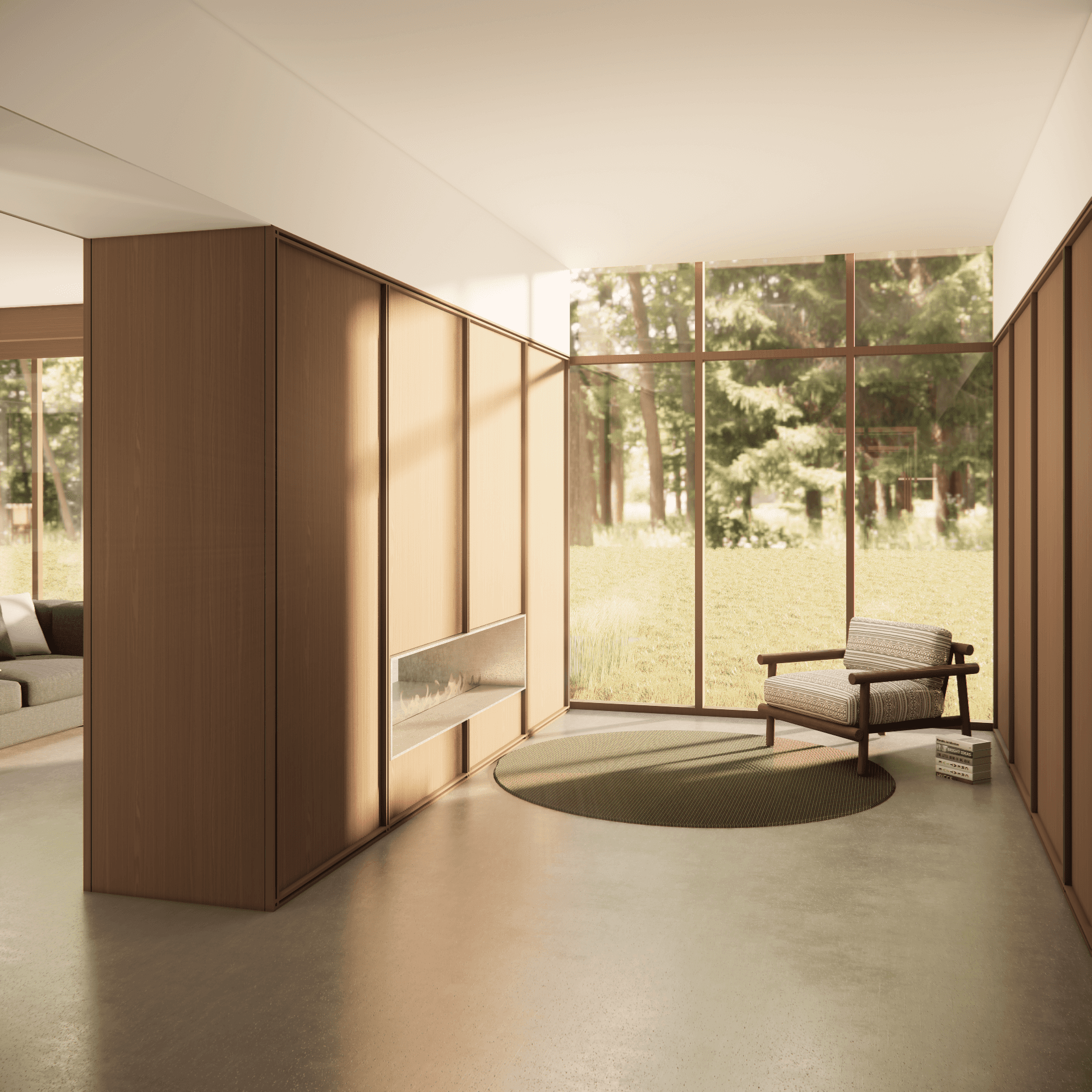 Composed of three low-slung brick volumes connected by two taller wood-clad wings, the Steuben Home creates a striking interplay of form and material. Expansive openings in the upper volumes frame panoramic views of the surrounding landscape, blending indoor comfort with natural beauty.