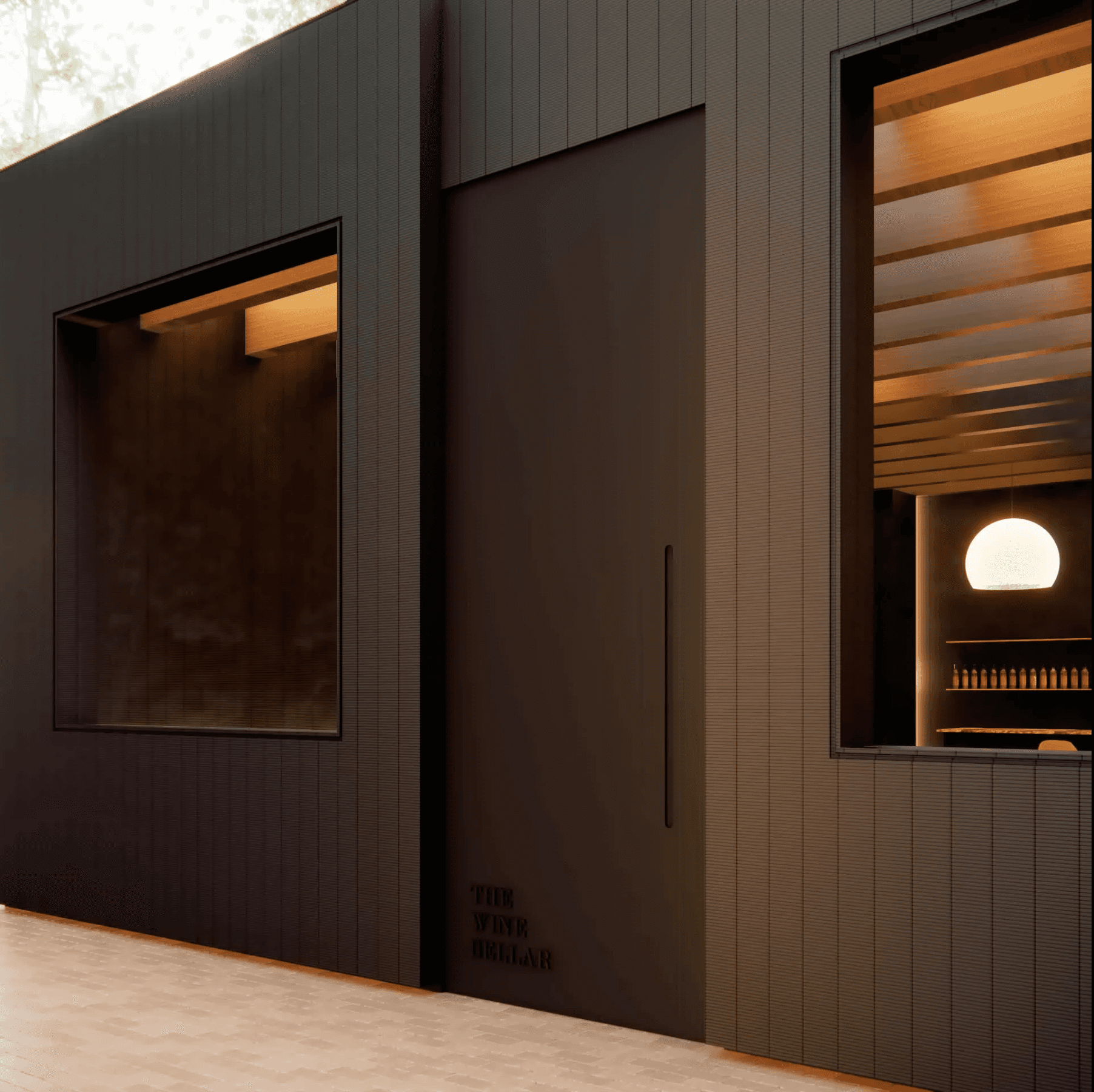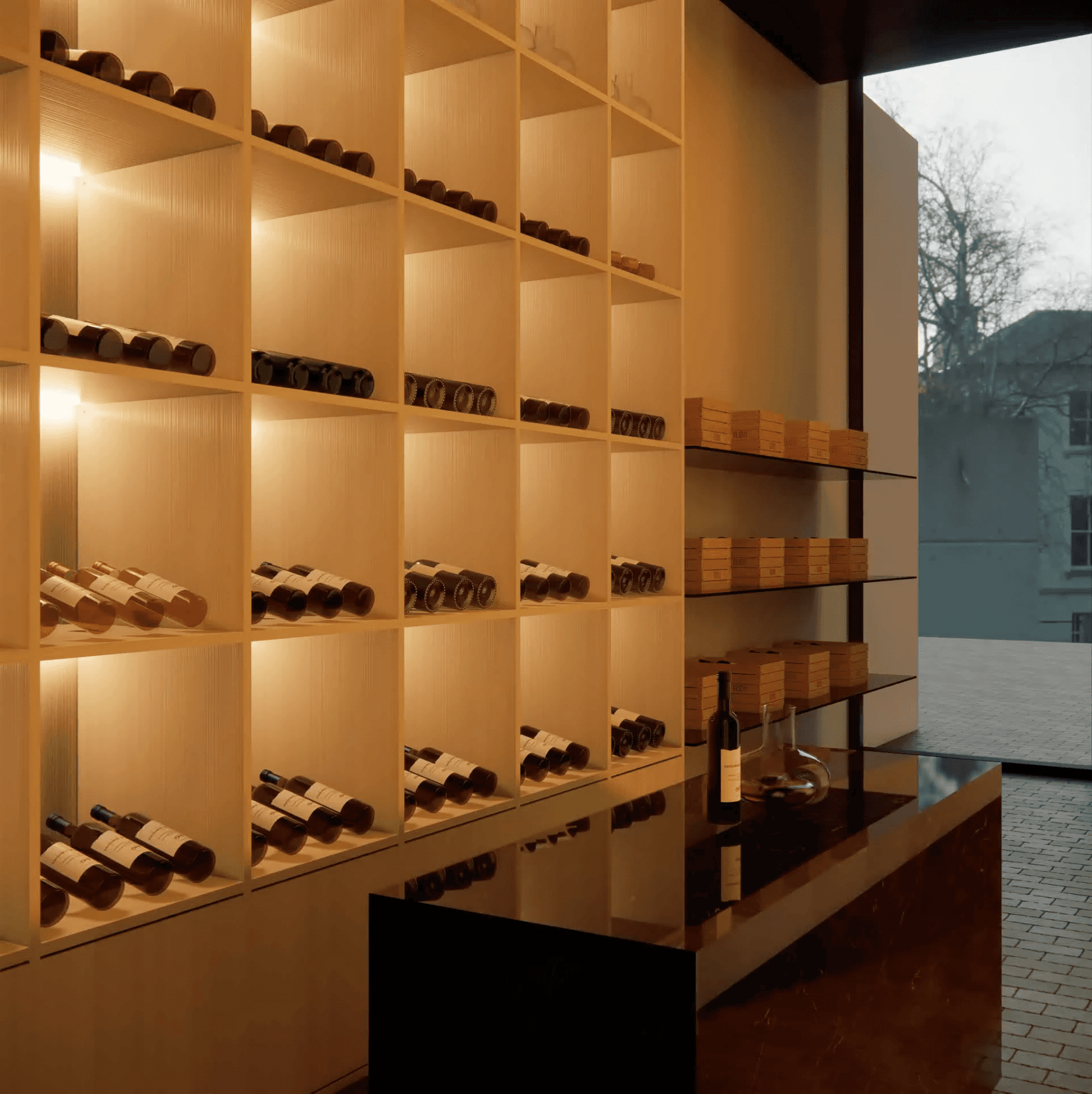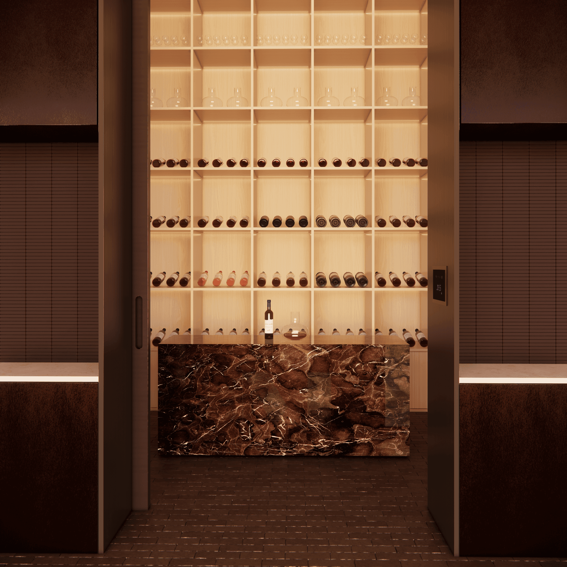 This wine cellar and tasting room is conceived as a quiet study in proportion, material, and light. Designed as a refined, immersive space, it balances warmth and precision through a restrained palette of natural stone, wood, and matte finishes. The architecture emphasizes rhythm and alignment—from the gridded shelving system to the soft glow cast across dark vertical surfaces. The concealed entry sets the tone for a space meant to be discovered gradually, while the bar and cellar invite lingering, conversation, and appreciation. At every scale, the design reflects a commitment to craft, clarity, and spatial calm.