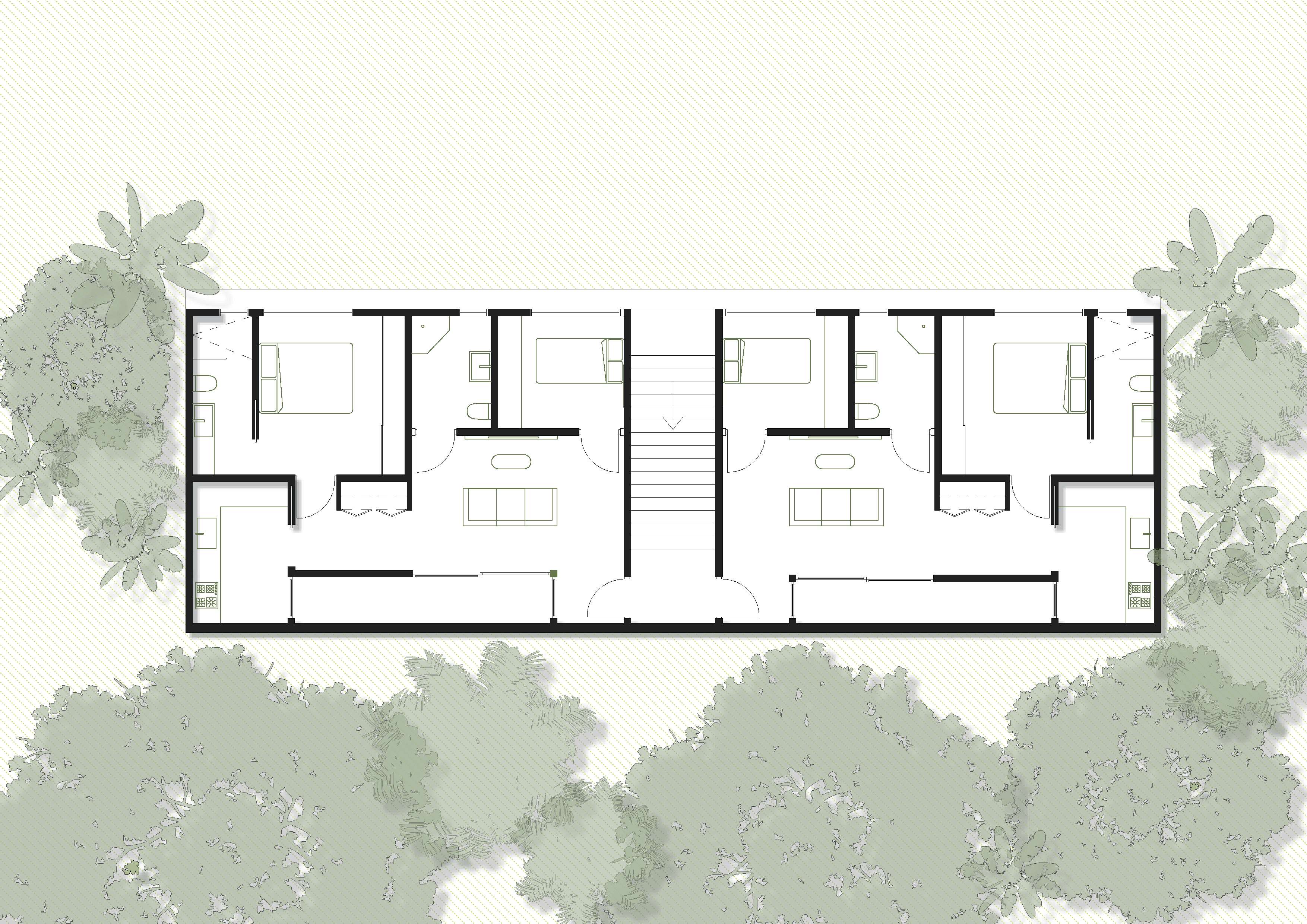 Paloma Residences is a two-story multifamily housing project located in Equatorial Guinea, designed to harmonize with the tropical climate and local context. The ground floor accommodates three independent apartments, while the upper level houses a spacious residence for the local family who commissioned the project. At its heart, a central courtyard provides natural light and ventilation to all units, fostering a sense of openness and community. The building’s façade features locally sourced stone tiles, offering both durability and a refined expression of regional craftsmanship, blending contemporary design with vernacular materials.